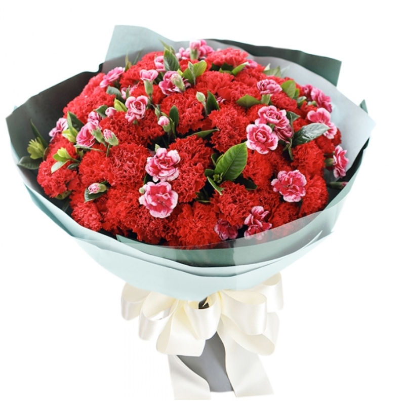 Букет состоит из 35 красных гвоздик, 10 кустовых гвоздик, красивая упаковка, атласная лента.