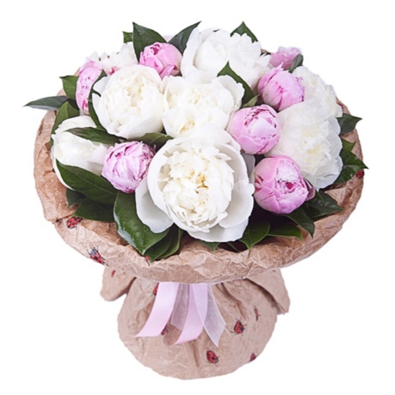 Букет из белых и розовых пионов в крафте