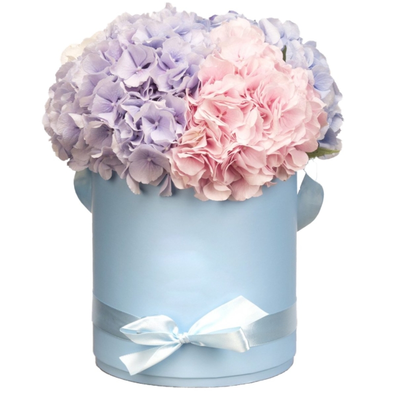 Букет состоит из 5 гортензий, коробка, атласная лента, оазис.
