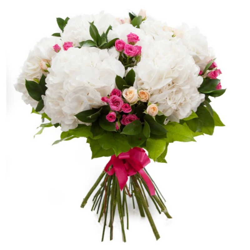 Букет состоит из 7 белых гортензий, 7 кремовых кустовых роз, 7 розовых кустовых роз, зелень, прозрачная упаковка, атласная лента.