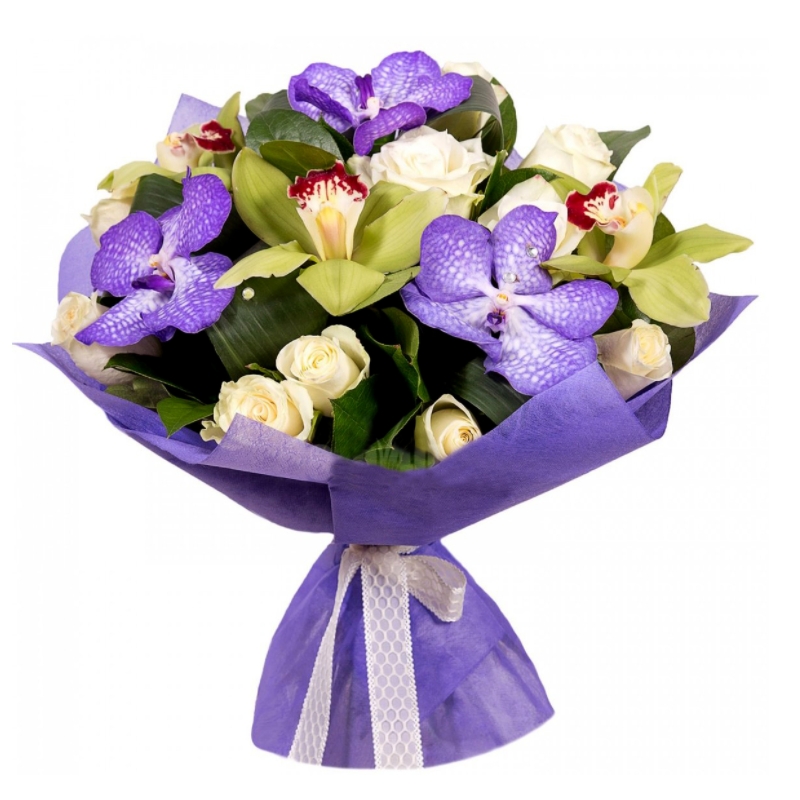 Букет состоит из 11 роз, 6 орхидей, зелень, красивая упаковка, атласная лента.