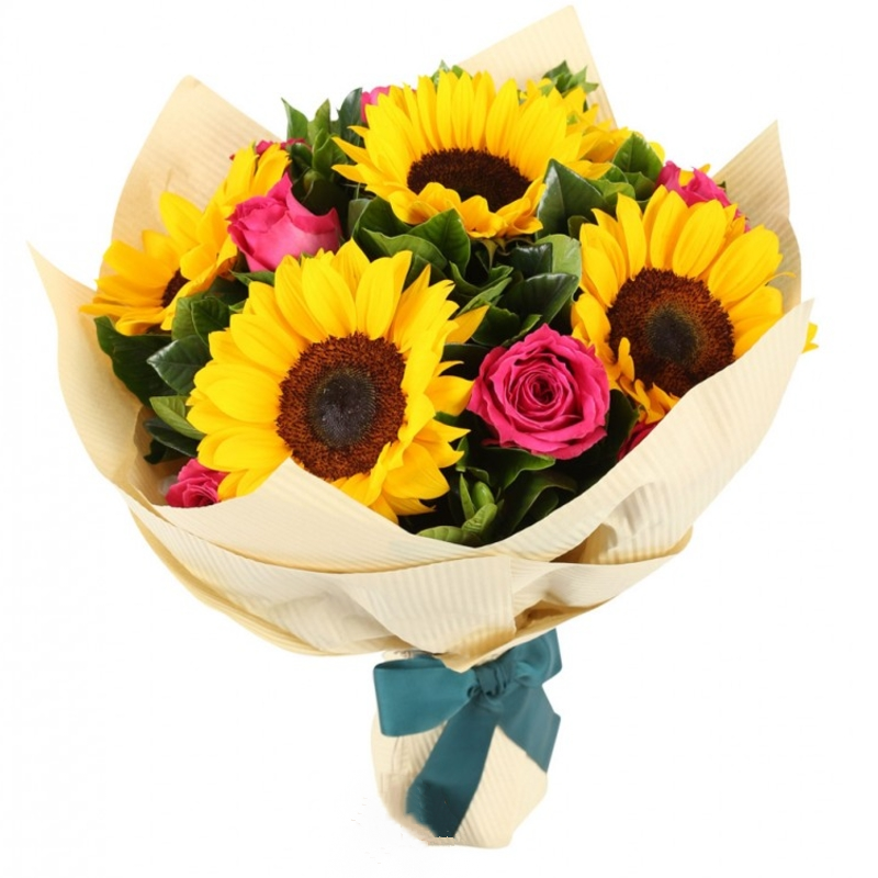 Букет состоит из 8 розовых роз, 5 подсолнухов, зелень, крафт, атласная лента.