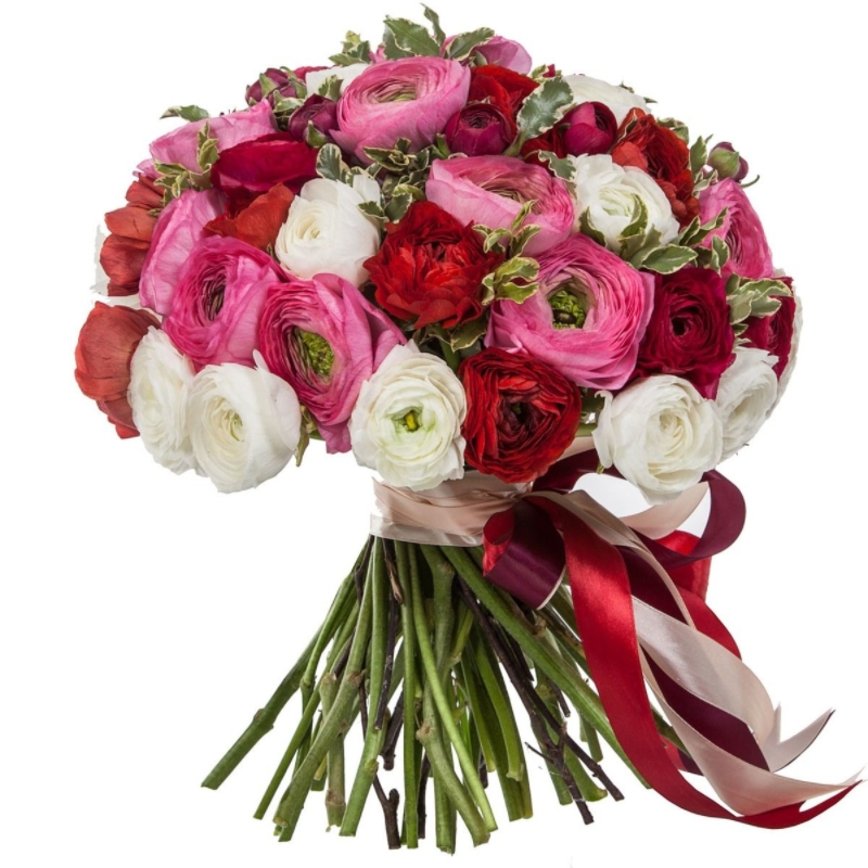 Букет состоит из MIX из 51 ранункулюса, зелень, прозрачная упаковка, атласная лента.