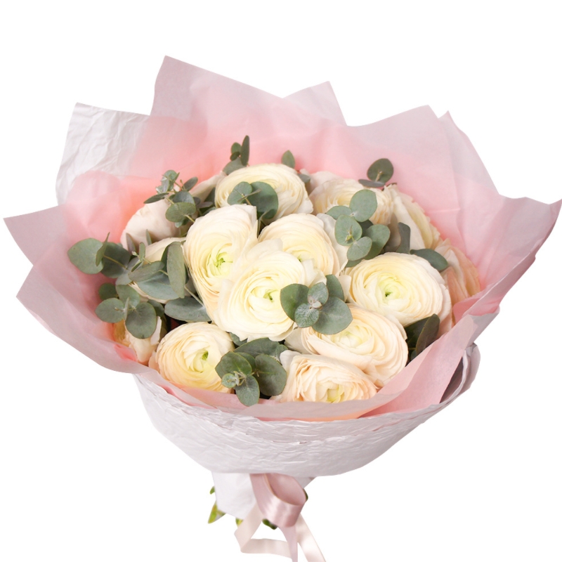 Букет из 19 ранункулюсов с эвкалиптом