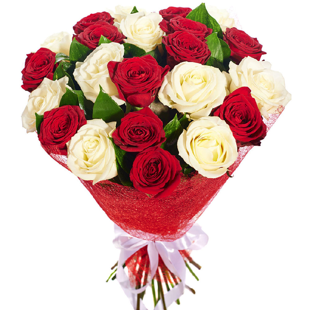 Букет состоит из 13 красных роз, 12 белых роз, зелень, красная упаковка, атласная лента.