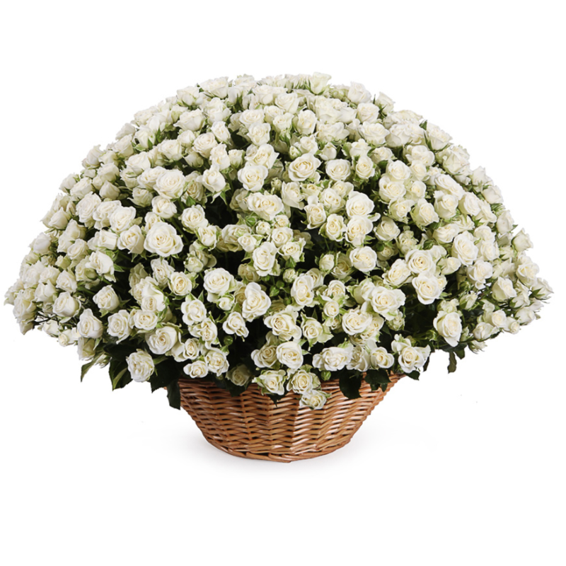 Букет состоит из 101 ветка белой кустовой розы, корзина, оазис.