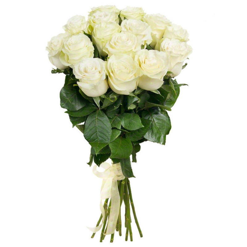 Букет состоит из 17 белых роз, лента.