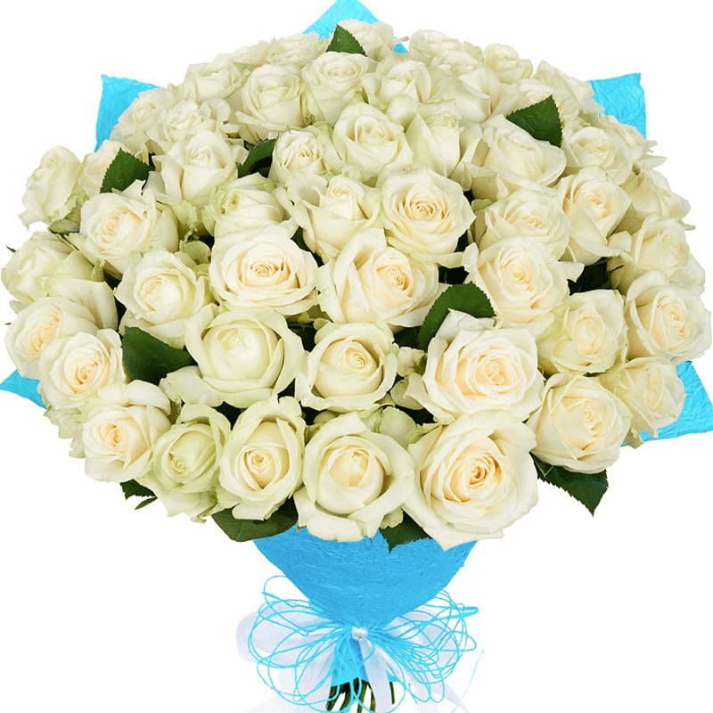 Букет состоит из 27 белых роз, синяя упаковка.