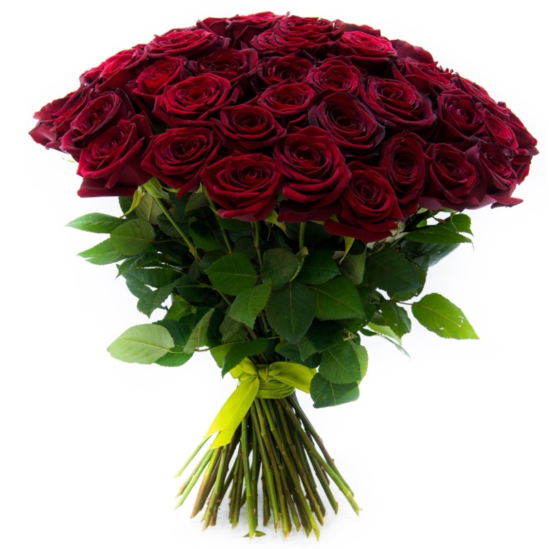 Букет состоит из 51 бордовая роза, прозрачная упаковка, атласная лента.
