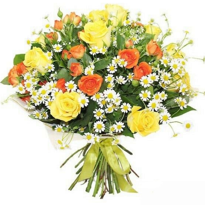 Букет состоит из 11 желтых роз, 6 кустовых оранжевых роз, 9 полевых ромашек, зелень, красивая упаковка, атласная лента.