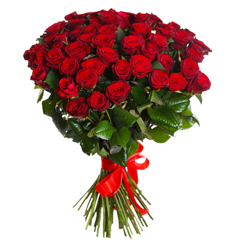 Букет состоит из 55 красных роз, прозрачная упаковка, красная лента.