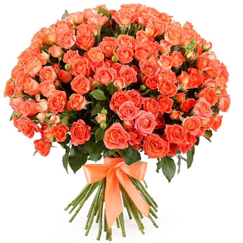 Букет состоит из 45 оранжевых кустовых роз, прозрачная упаковка, атласная лента.