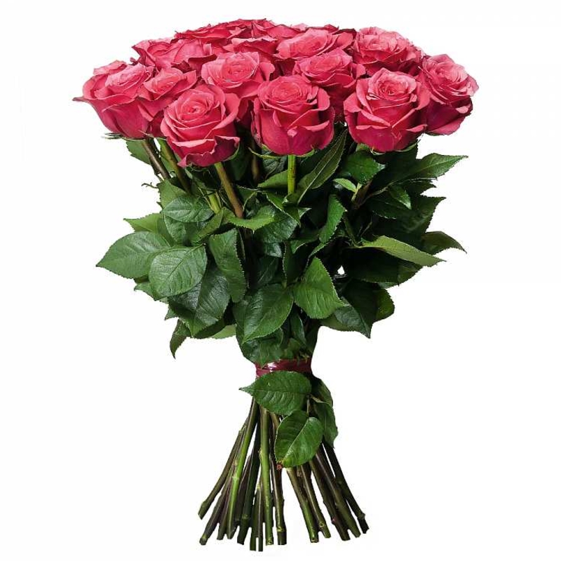 Букет состоит из 25 малиновых роз, прозрачная упаковка, атласная лента.