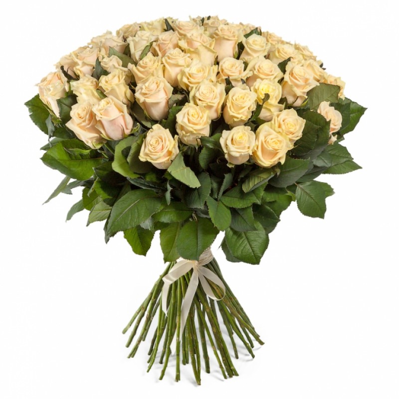 Букет состоит из 51 кремовая роза, атласная лента.