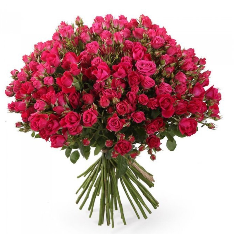 Букет состоит из 55 кустовых малиновых роз, прозрачная упаковка, атласная лента.