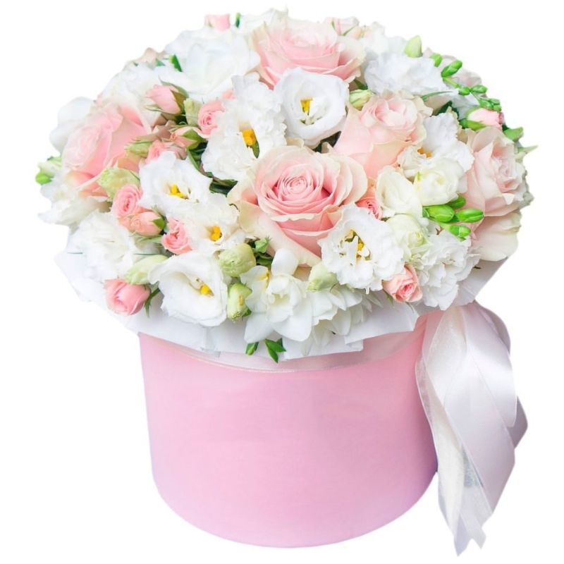 Букет состоит из 9 розовых роз, 5 веток кустовой розы, 9 веток эустомы, коробка, оазис.
